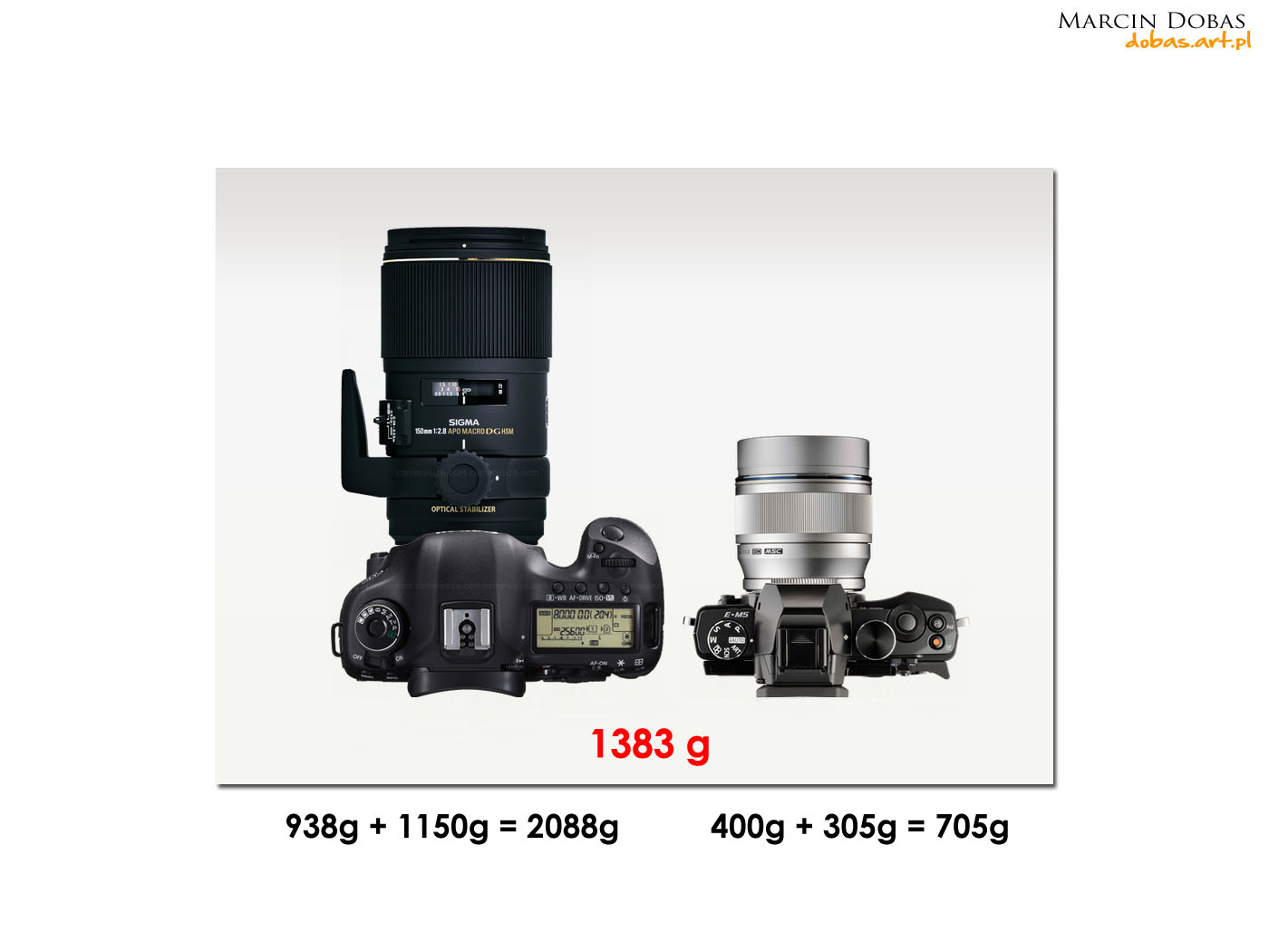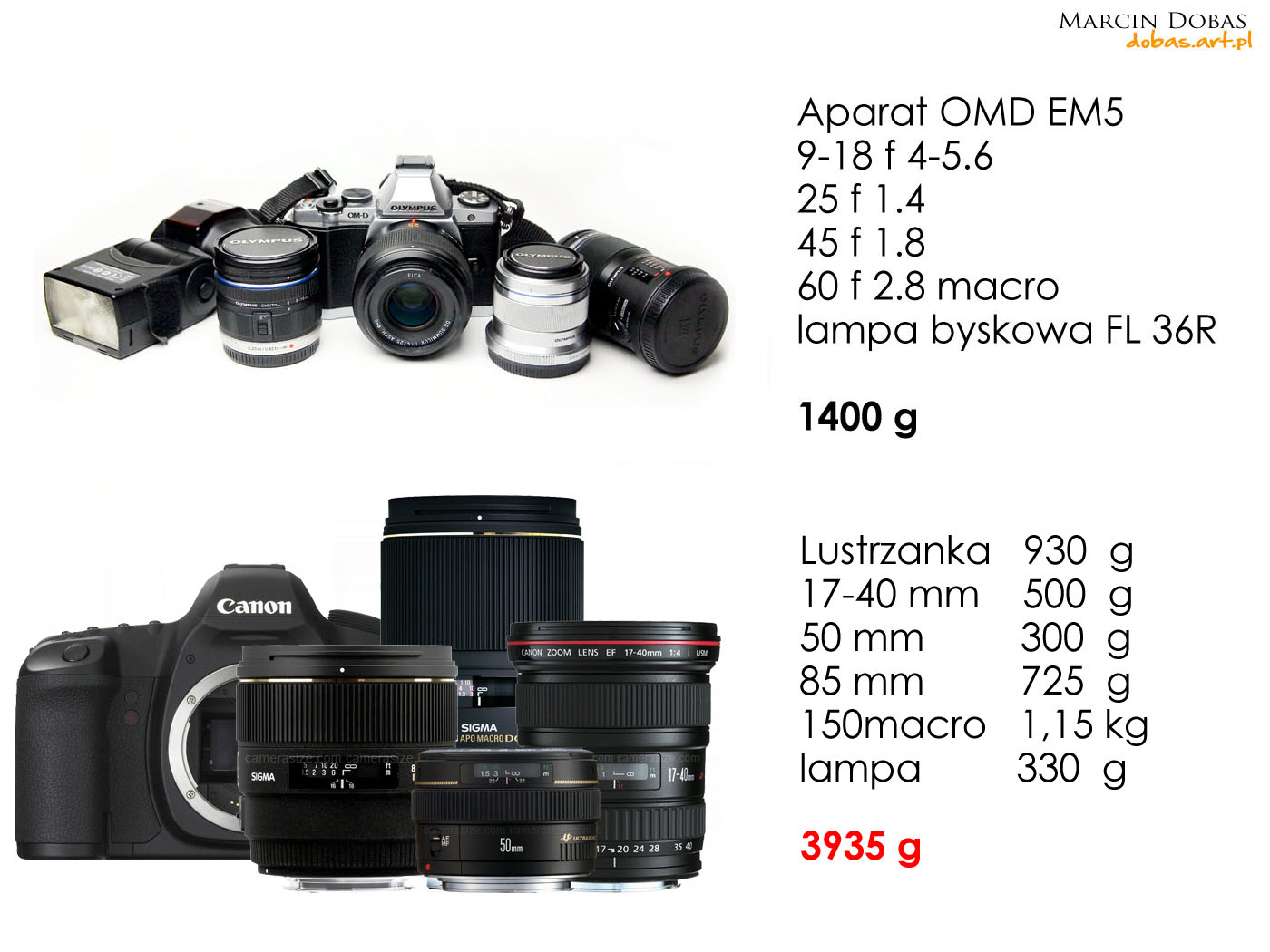 Jeden aparat i jeden obiektyw - 1400gram mniej w plecaku. A to tylko jeden aparat i jeden obiektyw. Jak dobrany - a no po prostu aby w terenie mieć szkło o takim samym kącie widzenia. I podobnej jasności. Po lewej f2.8 po prawej jaśniejszy f1.8