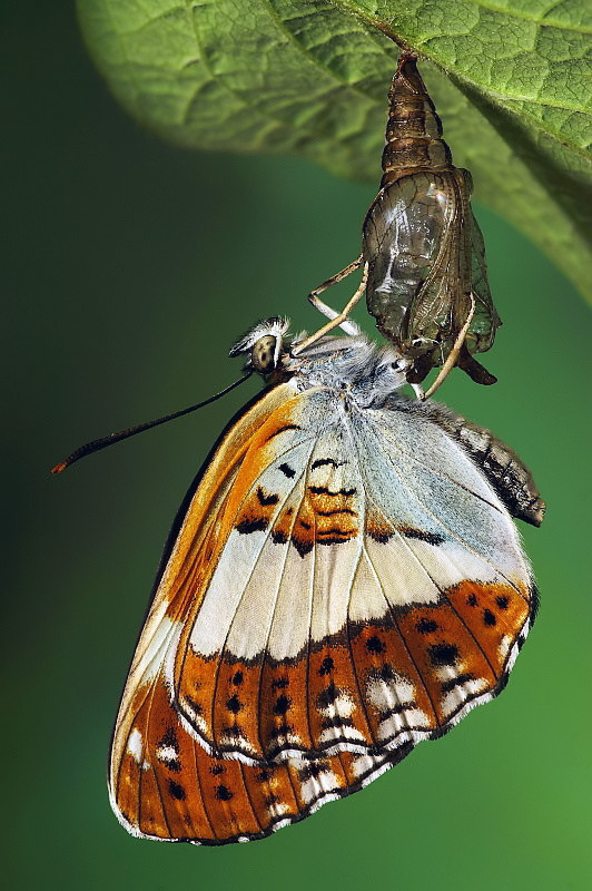 Ciekawy jestem so sądzisz o oświetlenu tego zdjęcia? Moim zdaniem zarzut o płaskim świetle jest od czapy, bo jak się przyjrzeć, to mimo płasko rozłożonego motyla widac fakturę skrzydła i wystających żyłek, a jednocześnie jest trochę efektu trójwymiarowości w kontakcie poczwarki z liściem.....Nie było by tych niuansów przy płaskim oświetleniu. do tego zdjęcie musiało być nieco niedoświetlone zeby nie przepalić bieli...stąd moze wiecej szumów wyłazi z tła