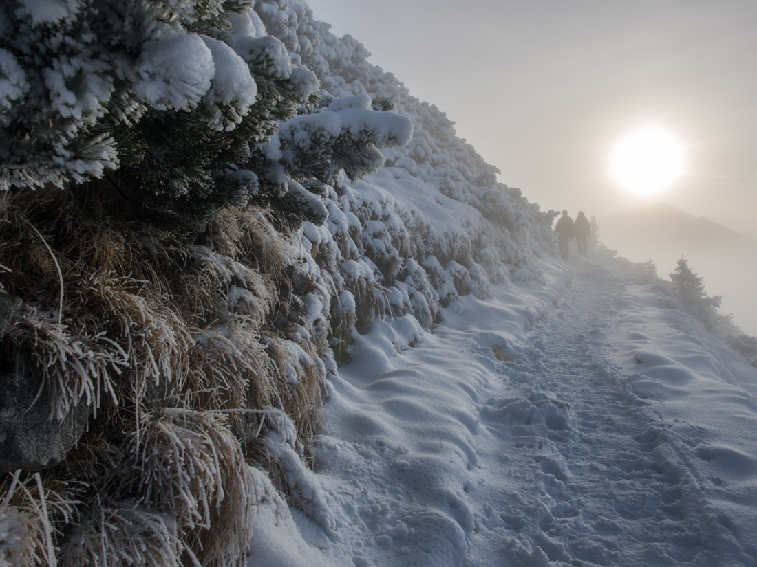 Szlak do Pięciu Stawów był pusty. Spotkałem tylko jedną osobę wracającą (jakaś chyba biegaczka) i jedną idącą do doliny. Szlak najpierw bez śniegu, powyżej lasu pojawił się śnieg a przy Siklawie lód. Turysta przede mną usiłował iść tam po kolanach ale po chwili się poddał i zawrócił. Prawdopodobnie lepsze warunki były na alternatywnym czarnym szlaku gdzie kilka osób wyszło bez raków choć tez narzekali na warunki.