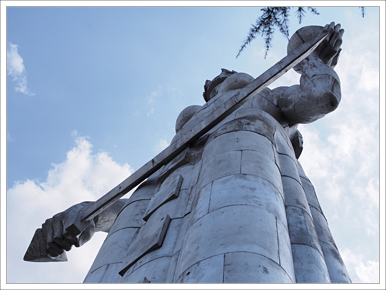 Jest w Tbilisi, niedaleko twierdzy Narikała 20 metrowy posąg kobiety która w jednej ręce trzyma czaszę z winem a w drugiej miecz. To "Matka Gruzja". Żeby nie było banalnie to zamiast zdjęć od frontu, takich jakie to wszędzie zobaczyć można, dam widoki z boku: