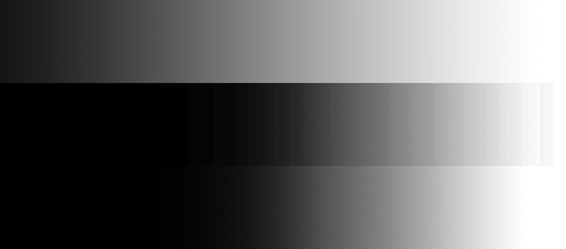 ..."W Photoshopie utwórzmy nowy 8 bitowy obraz (File->New) o rozmiarach np. 1024x300 pikseli z rozdzielczością np. 72 DPI. Obraz wypełnijmy gradientem od czarnego do białego. Następnie pięciokrotnie "męczymy" obrazek Levelami (Image->Adjustments->Levels lub ctrl+L) wstawiając naprzemiennie 2.0 i 0.2 dla parametru gamma (środkowy suwak albo środkowe okienko w wierszu Input Levels). Za każdym razem akceptujemy "poprawki" wciskając "Enter".Ja zrobiłem to dość precyzyjnie wpisując wartości z klawiatury ale nie jest to konieczne, to w końcu tylko eksperyment. Paskowanie jest widoczne już po pierwszej ingerencji. Po trzeciej "poprawce" nasze umowne zdjęcie jest zniszczone a po piątej to już katastrofa. Wiem, że mocno przesadziłem i że w praktyce aż tak duże niszczenie nie następuje. Bardziej chodzi mi uzmysłowienie czym grozi i skutkuje obróbka ośmio bitowych obrazków. Teraz wykonajmy drugą część eksperymentu. Zanim zaczniemy bawić się Levelami zmieniamy 8 bitowy obrazek w 16 bitowy (Image->Mode->16 bit/Channel). Potem dokonujemy na nim dokładnie takie same operacje i na koniec zamieniamy obrazek z powrotem na 8 bitowy. Rezultat poniżej. U góry oryginał, w środkowym rzędzie wynik działań na 8 bitach i na samym dole te same działania na 16 bitach. ..."