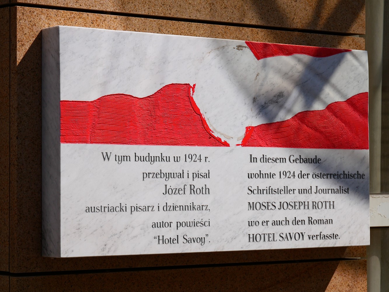 Coś z innej beczki - tablica pamiątkowa, z której usunięto wizerunek Josepha Rotha. Umieszczono ją na fasadzie hotelu Savoy, przy ul. gen. Romualda Traugutta w Łodzi.