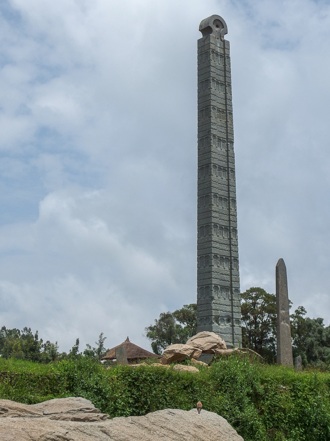 Granitowy obelisk z Aksum w Etiopii o wysokości 23 m i wadze około 200 t postawiony w IV w. za panowania króla Ezany. W XVI w. obalony przez muzułmanów a w 1937 roku wywieziony do Rzymu przez włoskich okupantów. Po kilkudziesięciu latach nacisku ONZ, włoski rząd w 1997 r. zdecydował się na zwrot zabytku. Transport morski odpadał ze względu na brak dostępu Etiopii do morza. W 2005 r. pocięty na trzy części i trzema kursami przetransportowany największym samolotem transportowym Antonow AN-124 Rusłan do Aksum. Odsłonięty w roku 2008.