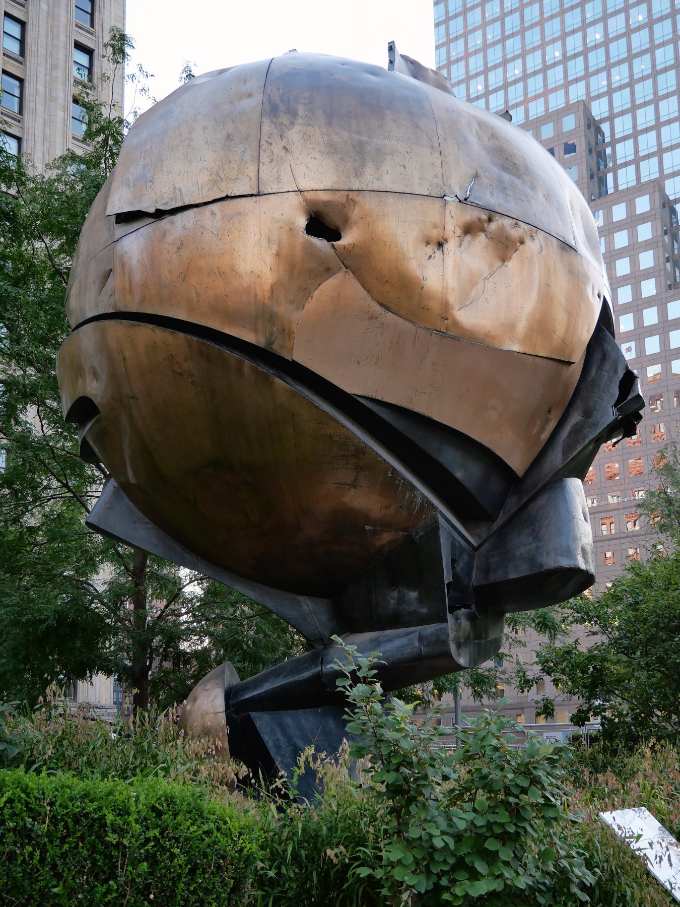Ze śladami zniszczeń jakich rzeźba zaznała podczas zamachu na World Trade Center... Ciekawy świadek historii.
