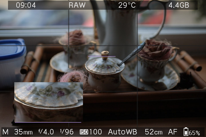 Może lepiej będzie jak pokażę screena:natomiast zamiast wszystkich peakingów, rastrów i lupek wolę histogram i stare dobre powiększenie 1:1, dostępne chyba w każdym aparacie z lv.