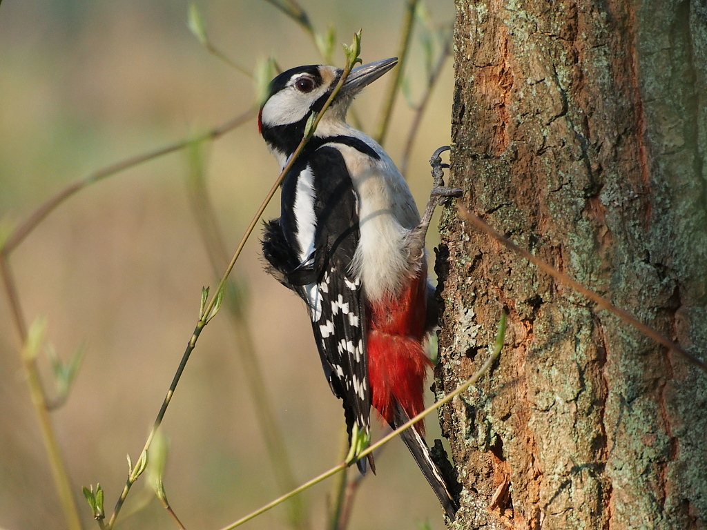 Dzięcioł co chwila przerywał prace i dokładnie badał co dzieje się wokoło