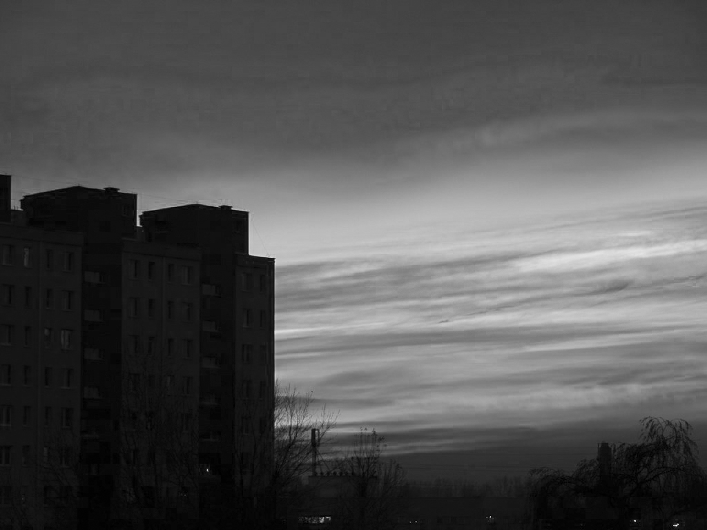 Gdybys robil ten kadr od poczatku na czarno bialym filmie z zakreconym filtrem (powiedzmy)niebieskim,to chyba wygralo by czarno biale.Tu raczej wygrala by groza tych chmur a nie ich kolor.Pokombinuj z konwersja przyciemniajac te czerwienie i rozjasniajac pozostale -bedzie inaczej,bardziej w strone Cz-B