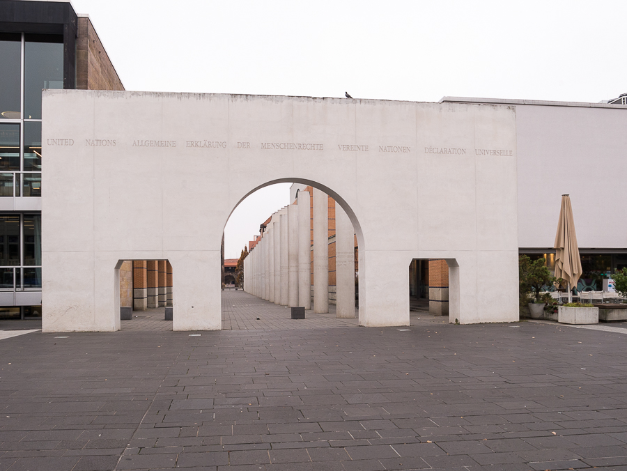 Zimą 1945 roku Norymberga po serii alianckich nalotów dywanowych legła w gruzach. Zabudowania muzealne także bardzo ucierpiały. Po wojnie połączono resztki klasztoru kartuzów z nowoczesną architekturą, całość znacznie rozbudowano w latach 90. Przeszklona konstrukcja Museum-Forum z rozległym holem wejściowym robi dziś ogromne wrażenie. Podobnie jak umieszczone na zewnątrz monumentalne kolumny tworzące Drogę Praw Człowieka. Kolumn jest trzydzieści, ponieważ tyle artykułów zawiera Powszechna Deklaracja Praw Człowieka. Na każdej kolumnie wyryto tekst w języku niemieckim i obcym. Nam przypadł w udziale artykuł 6.: Każdy człowiek ma prawo do uznawania wszędzie jego osobowości prawnej.