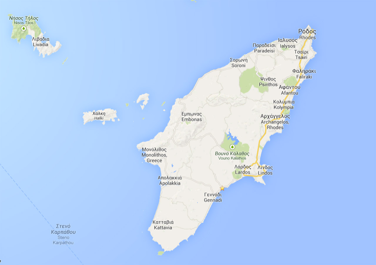 Bazę obraliśmy na południowym brzegu wyspy nieopodal miejscowości Kiotari. (gwiazdka na mapie) Jest to zdecydowanie mniej oblężona okolica niż takie kurorty jak Faliraki czy północne wybrzeże wyspy w pobliżu Rodos.