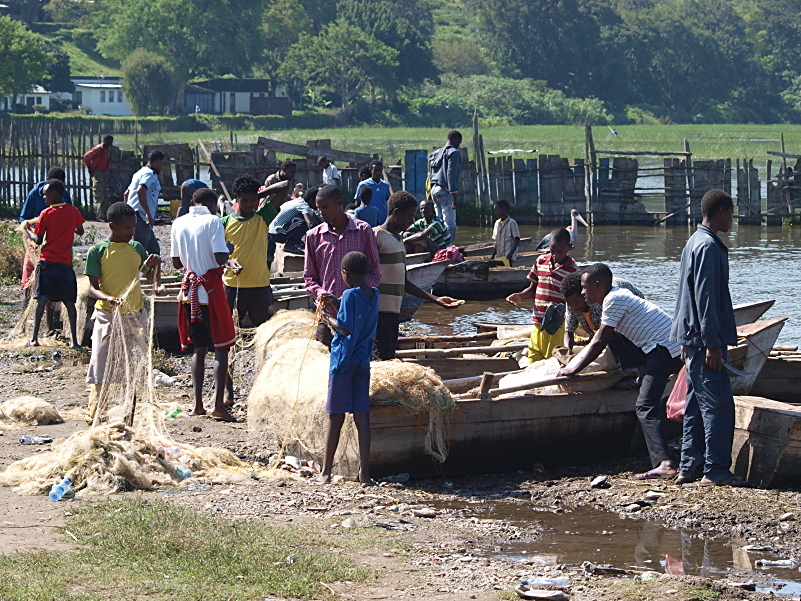 Wizyta na targu rybnym nad jeziorem Auasa była okazją na spróbowanie świeżej smacznej rybki tilapiii podglądanie pracy rybaków. Zauważyłem ciekawy sposób na filetowanie surowych ryb, młodzi chłopcy nie robią tego rękoma, a z pełnym zawodowstwem... zębami