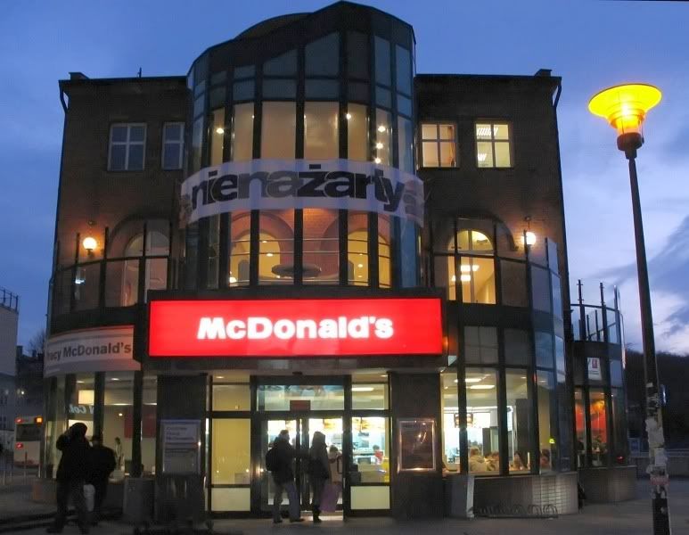 Mi najbardziej podoba się nr 10 - widok na ul. Partyzantów. Niezła mogła by być 11 - ale jak dla mnie za szeroko. Moją uwagę zwrócił za to chyba Polonez ustępujący pierwszeństwa przejazdu pojazdowi szynowemu - o losie, co to za skojarzeniaNatomiast McDonald jakoś mi się nie widzi.