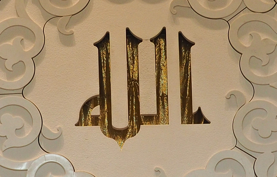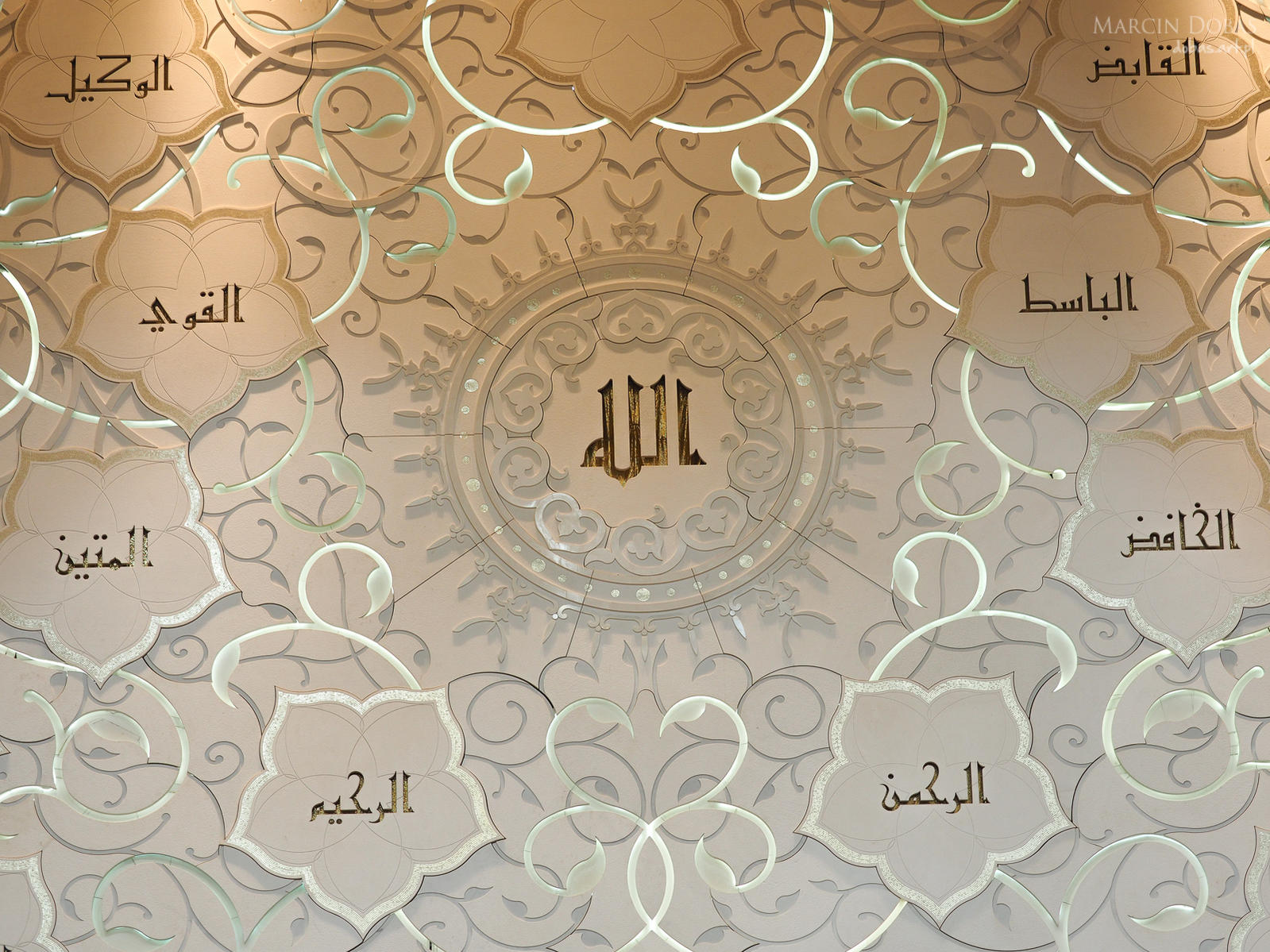 Zjednoczone Emiraty Arabskie, Abu Dhabi, Abu Dhabi, Sheikh Zayed Grand Mosque. 99 imion Allaha wypisane na ścianie wskazującej kierunek Mekki ( prostopadła do linii łączącej meczet z Kaabą w Mecce )