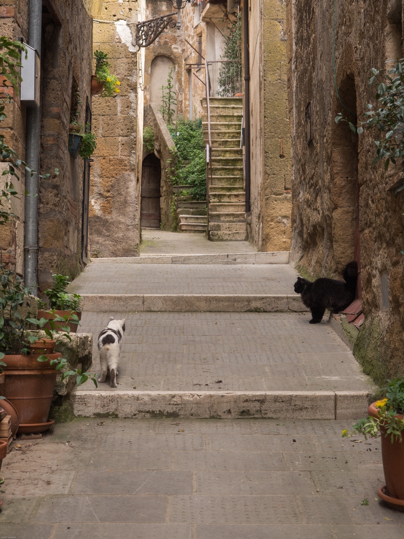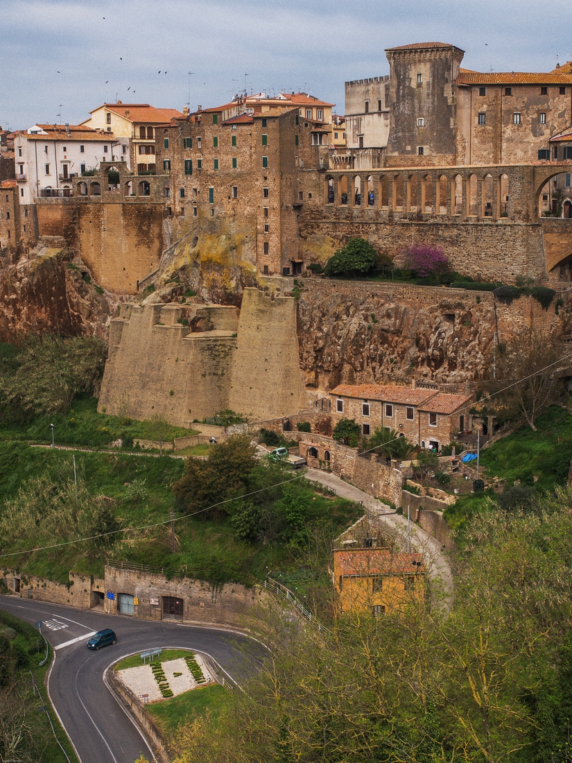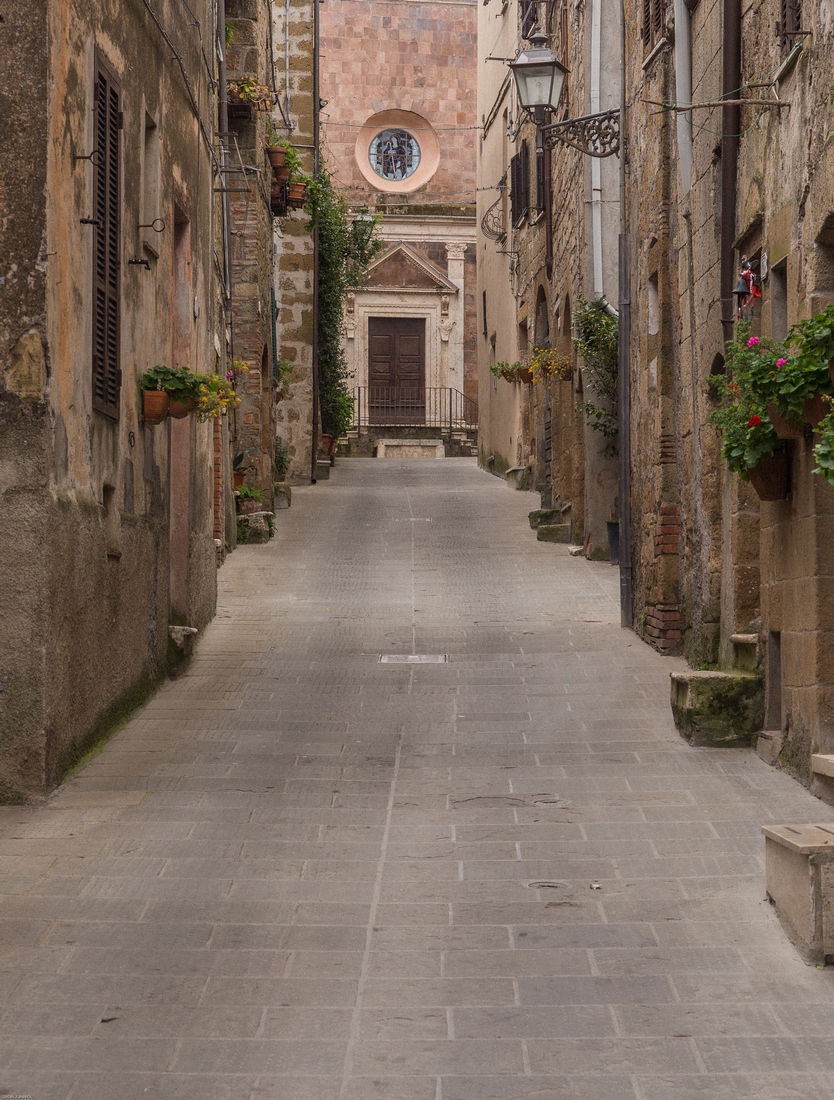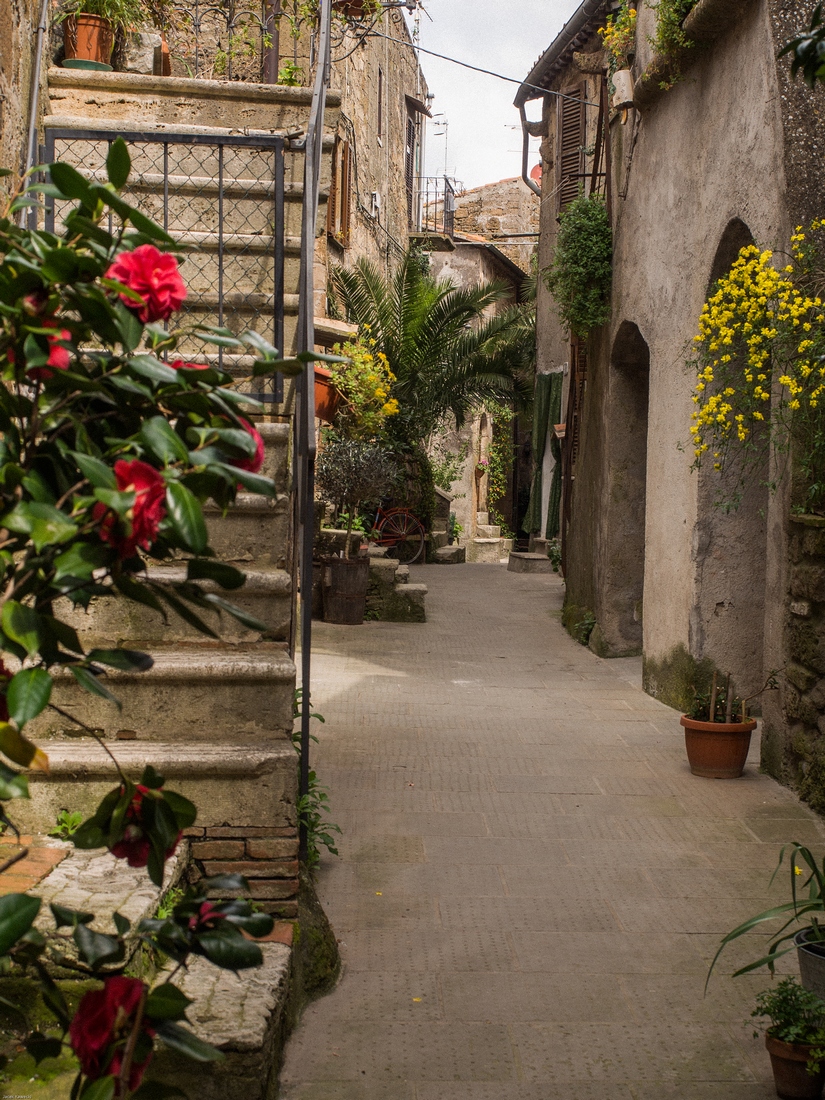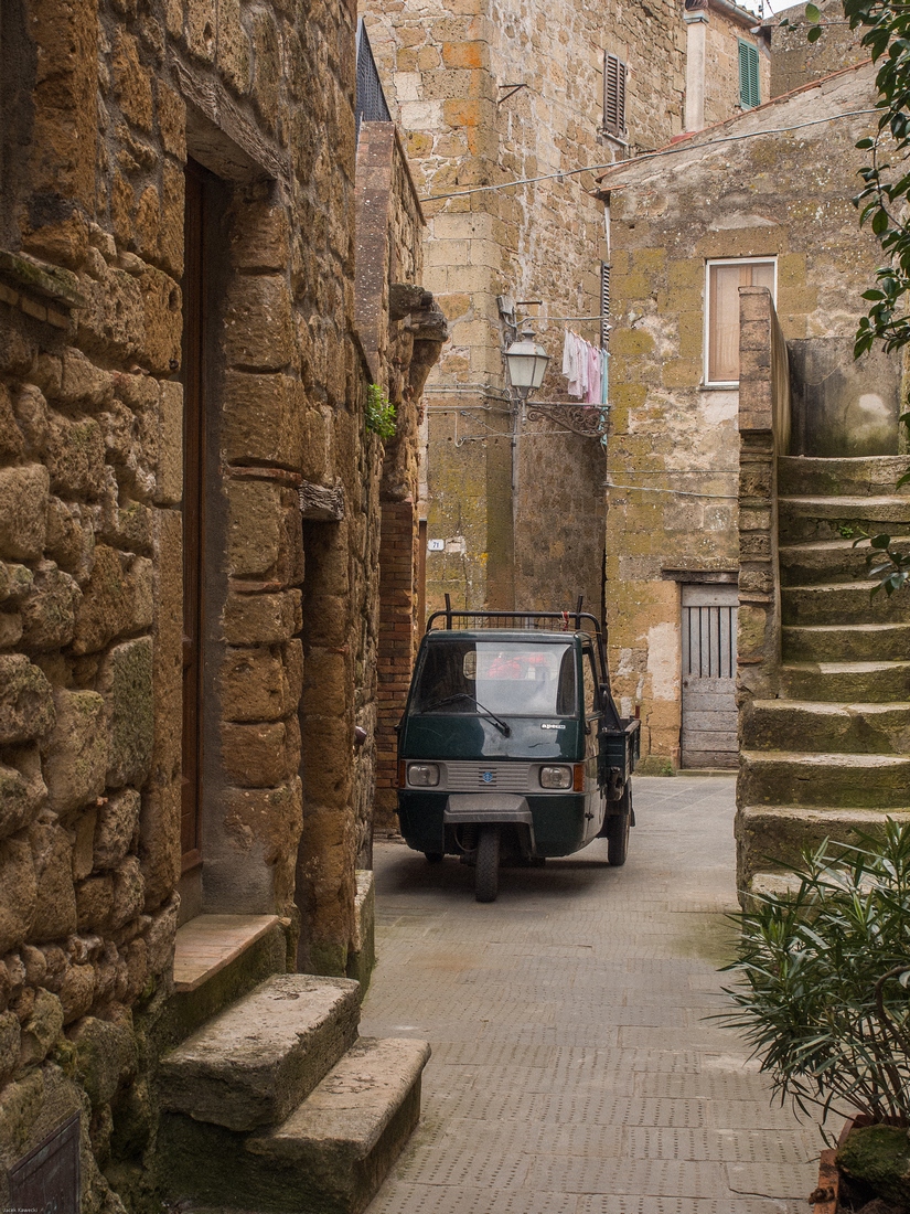 Pitigliano jest miejscem zamieszkania ponad 4.000 ludzi. Podejrzewam, że wrażenie,że wygladają pusto wynika ze sposobu aktywności ludności lokalnej. Jej godzin funkcjonowania w przestrzeni publicznej. Miasteczko jest dłużej wymieniane w materiałach pisanych od większości miejscowości polskich. To jest powszechna tam prawidłowość - wtedy gdy oni budowali swoje chwalące Boga katedry my chodziliśmy po dróżkach w puszczach lub zaczynaliśmy karczować te puszcze....Murowane grody powstawały w późniejszych wiekach.