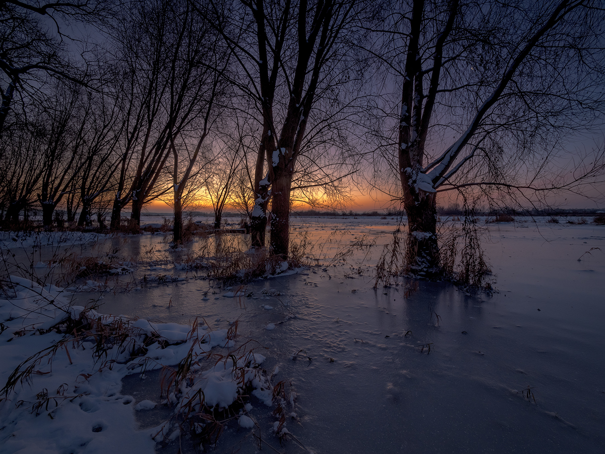 Najbardziej się podoba 444. Linia łódek, gasnące niebo, zaśnieżony lód, połyski, linie śladów i drzewa jak zawsze ciemne rezczapierzone, stróżujące.